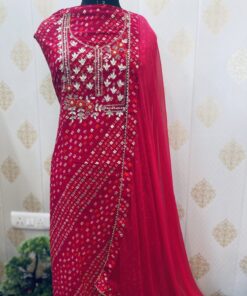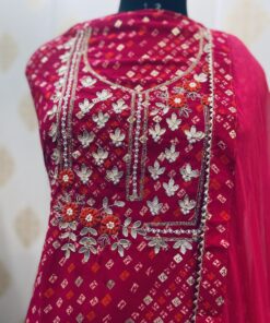 - Bandhani printed kurta with gotta patti work plain pants and lace on the sides of dupatta.