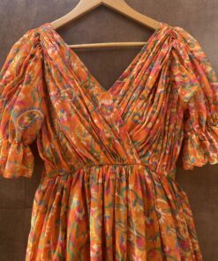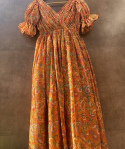 - Chiffon printed pleated dress, floor length dress with puff sleeve.