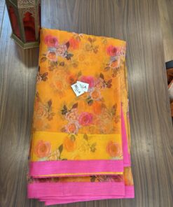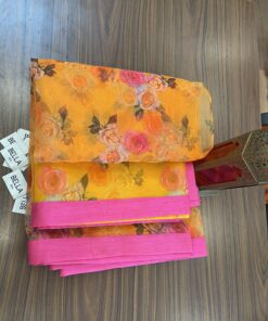 - Orange organza saree with magenta patti highlight on the sides.