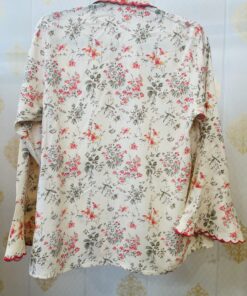 - Printed shirt style top with thread cutwork in front, collar and on sleeves.