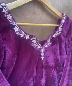 - Purple velvet kurta with thread work on the neckline and scalping on the sleeves.