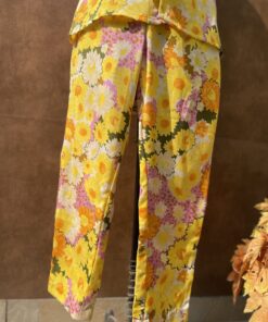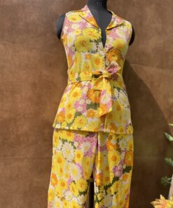 A perfect pair of floral print summer cord set. It is embellished with the beads work on the collar and same fabric belt to enhance the overall look.