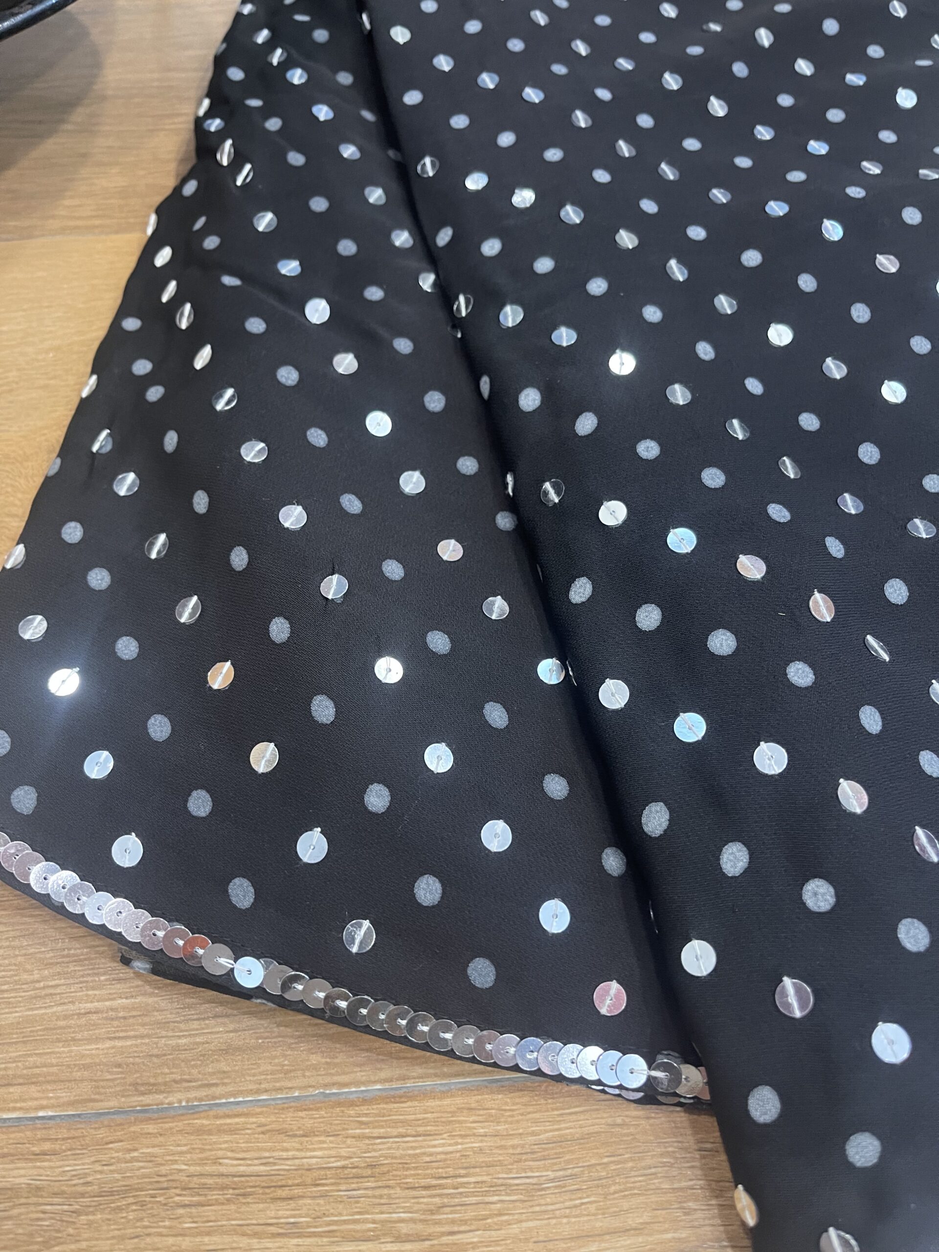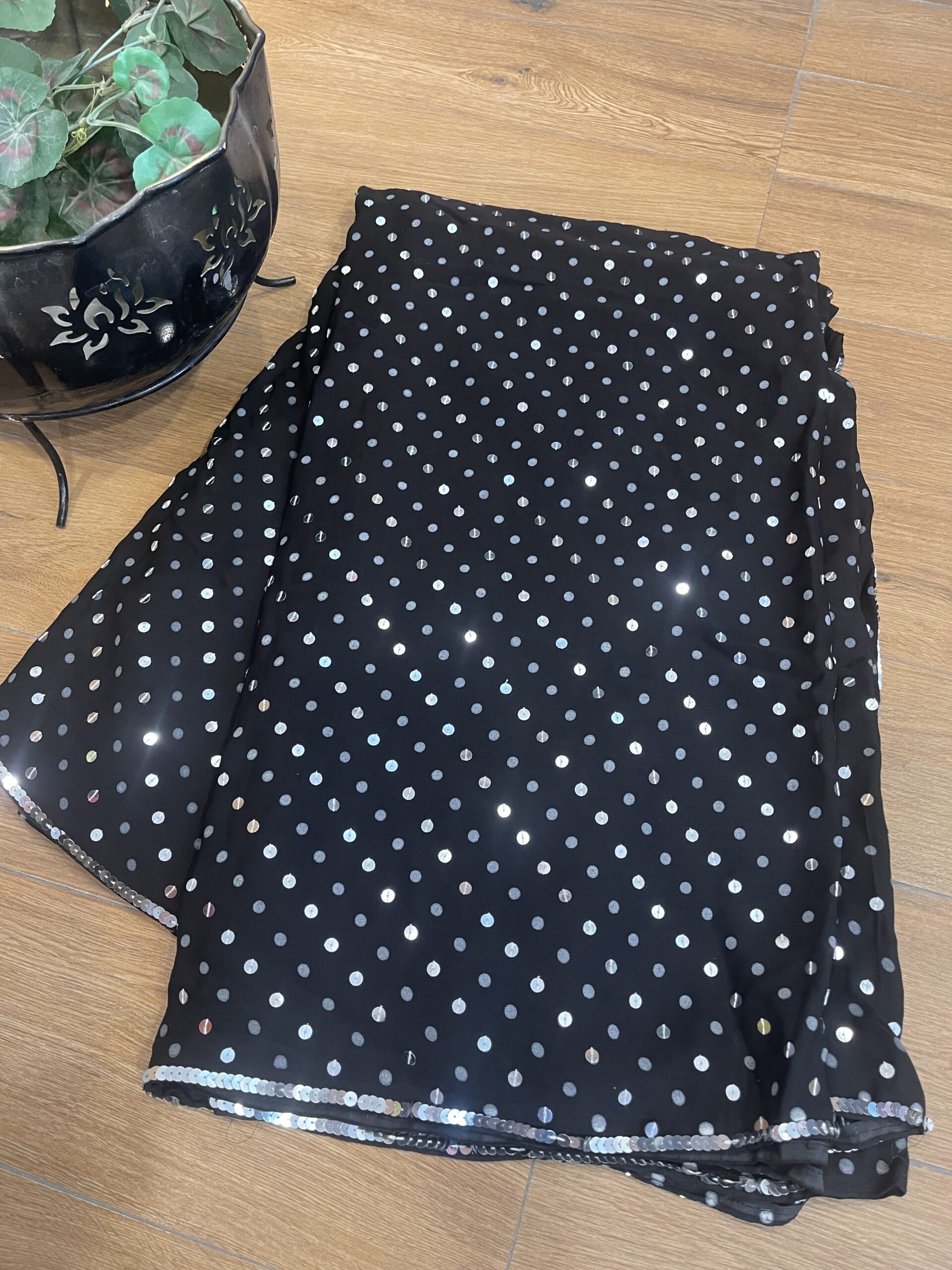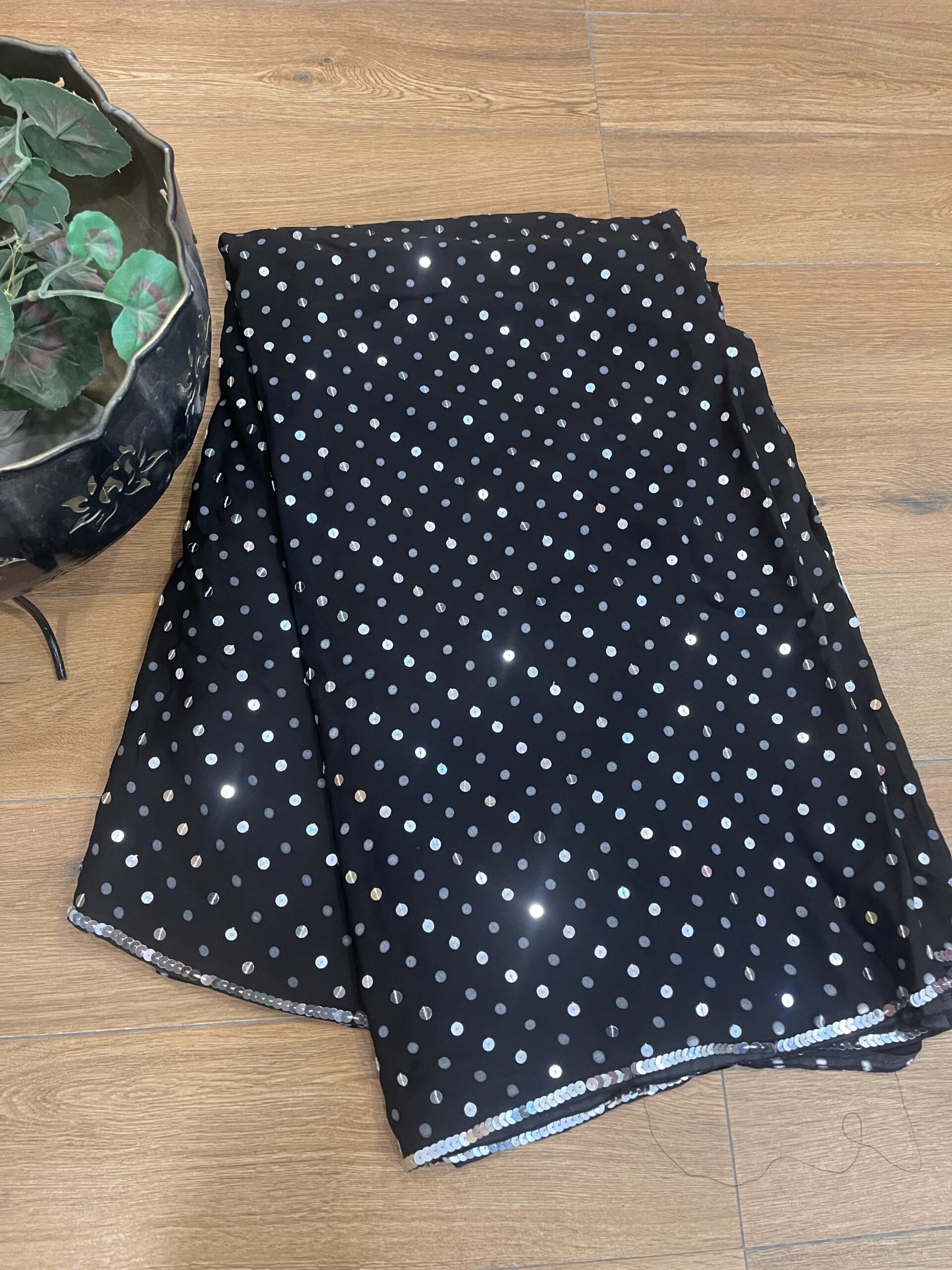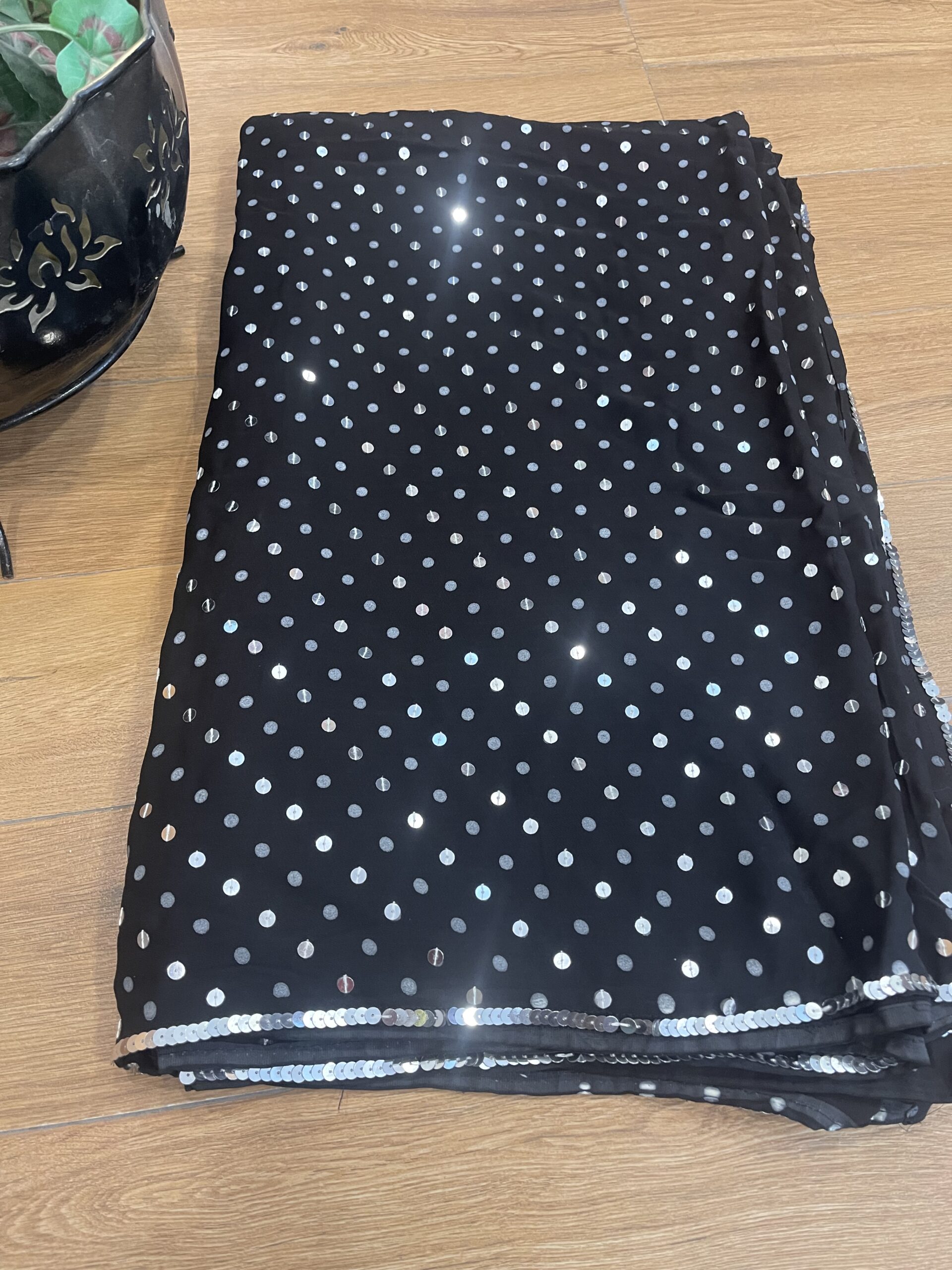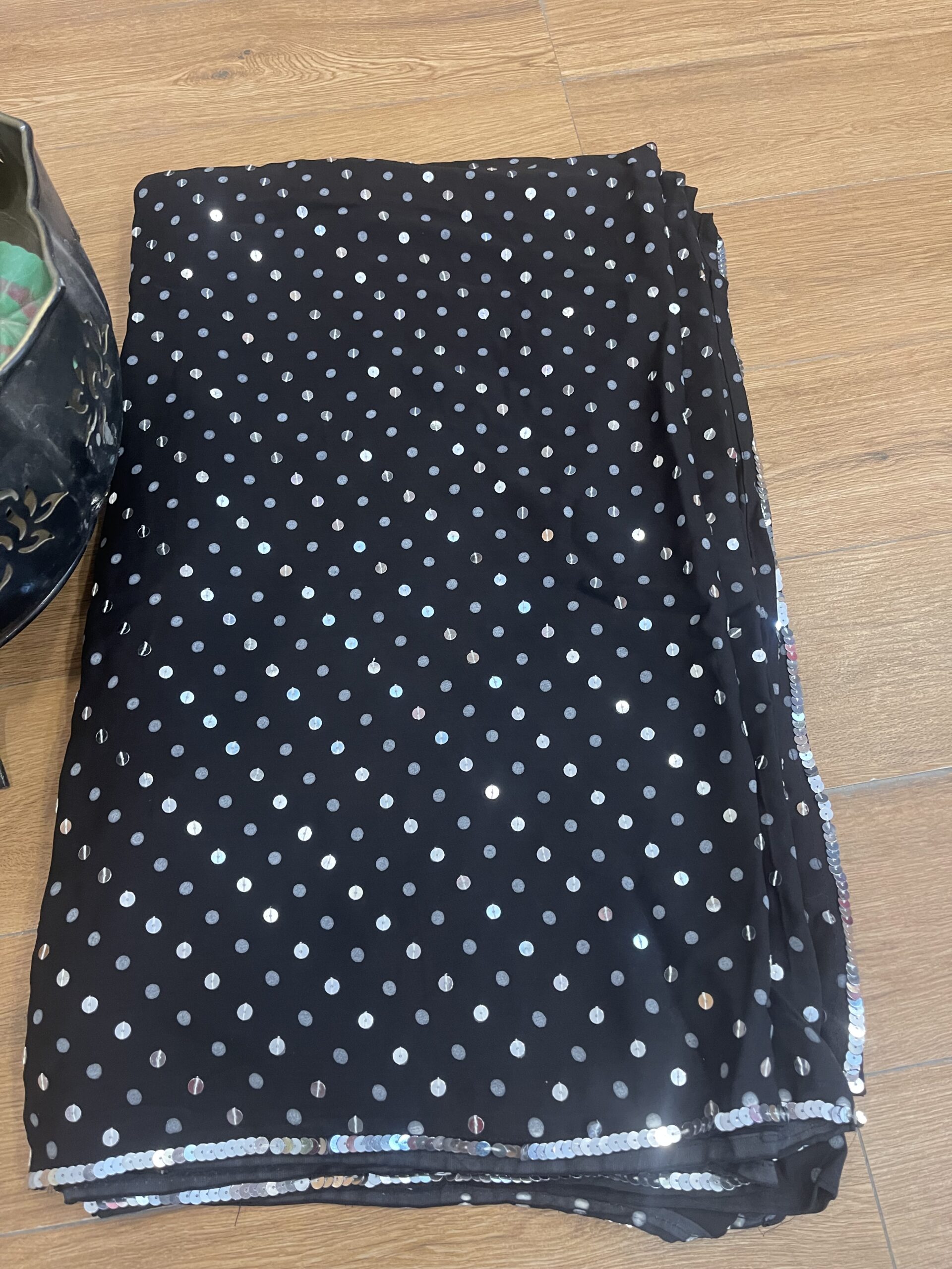 - Georgette saree with print and handwork on the full pallu part and half pleats with a line of sequins on the edges of the saree.