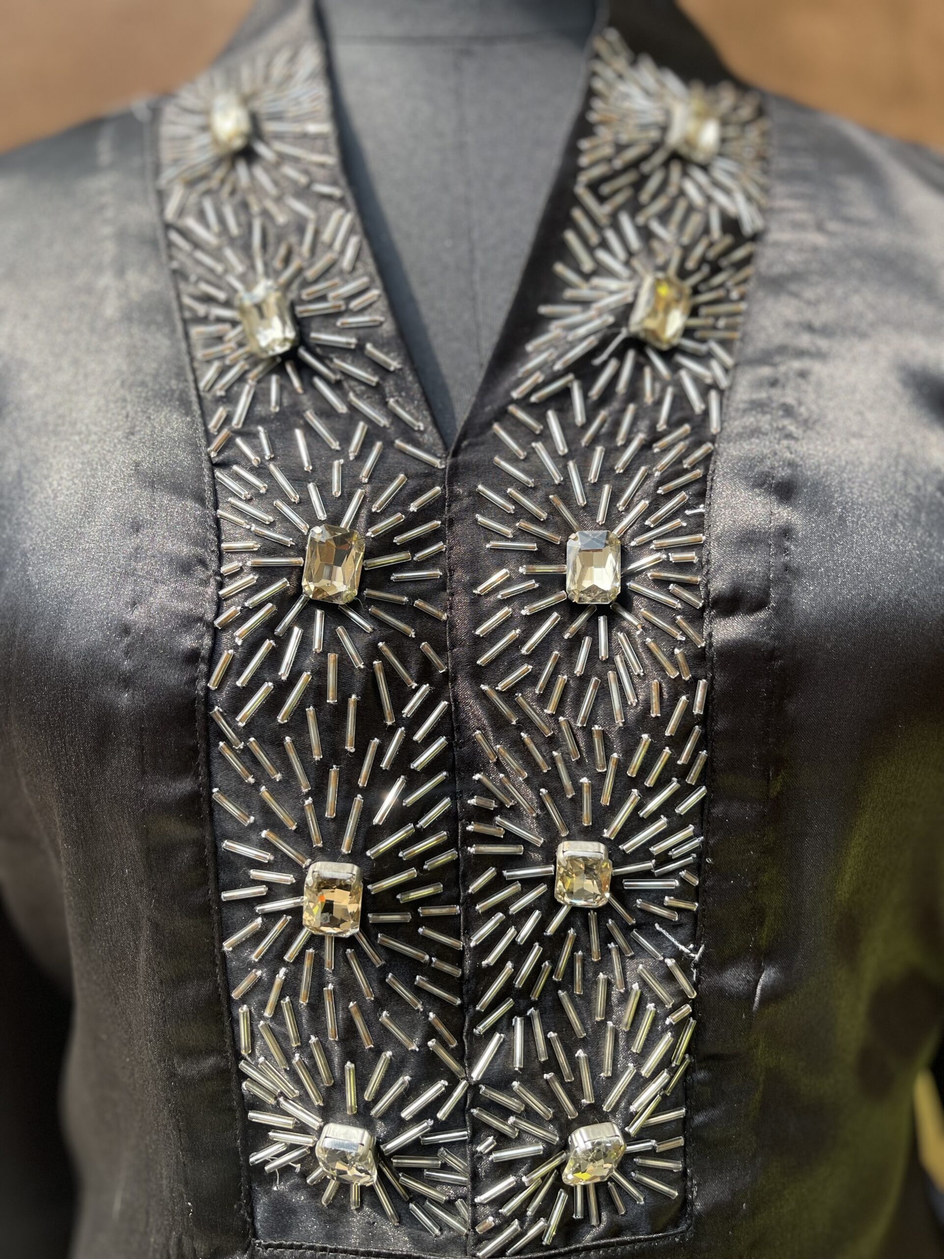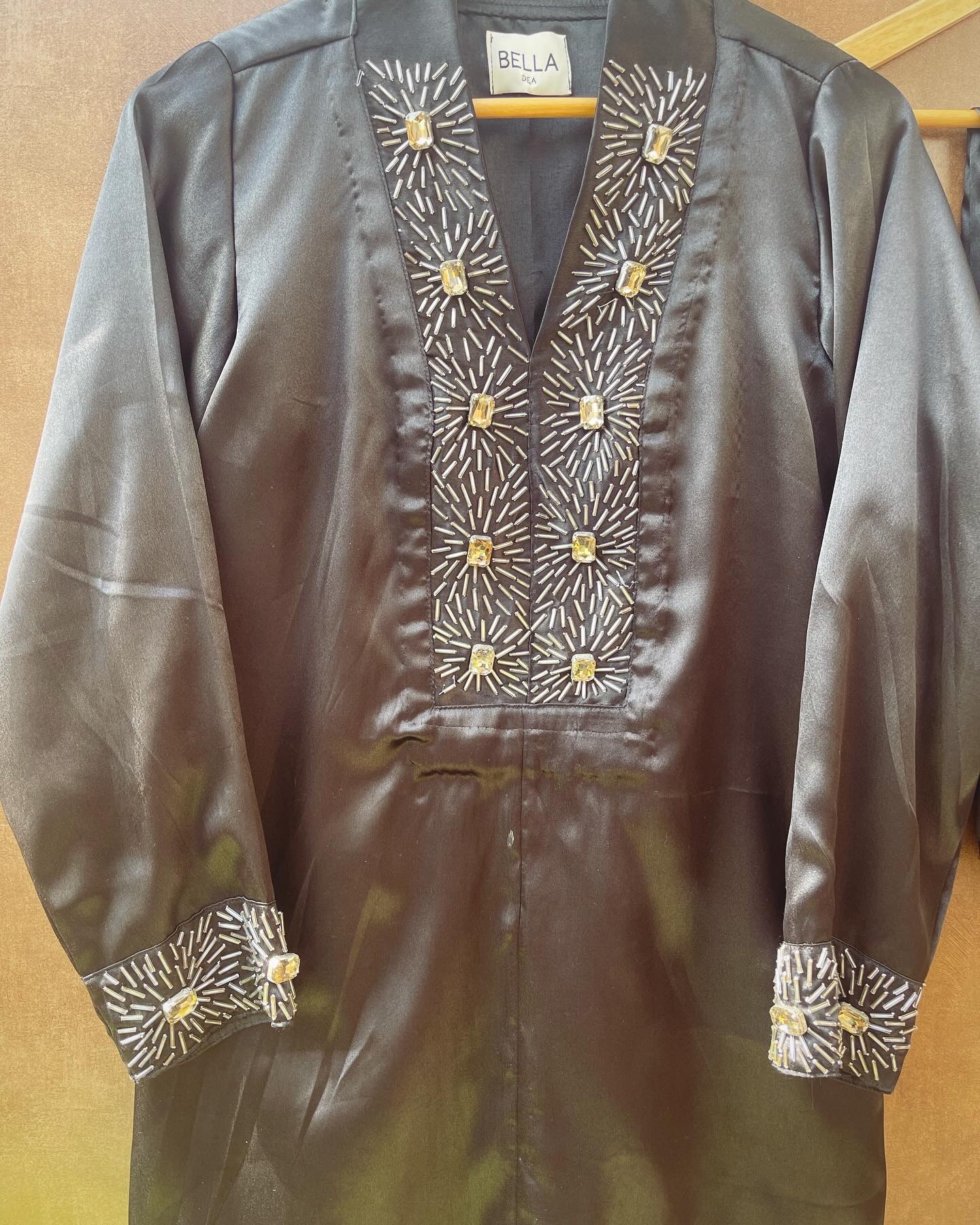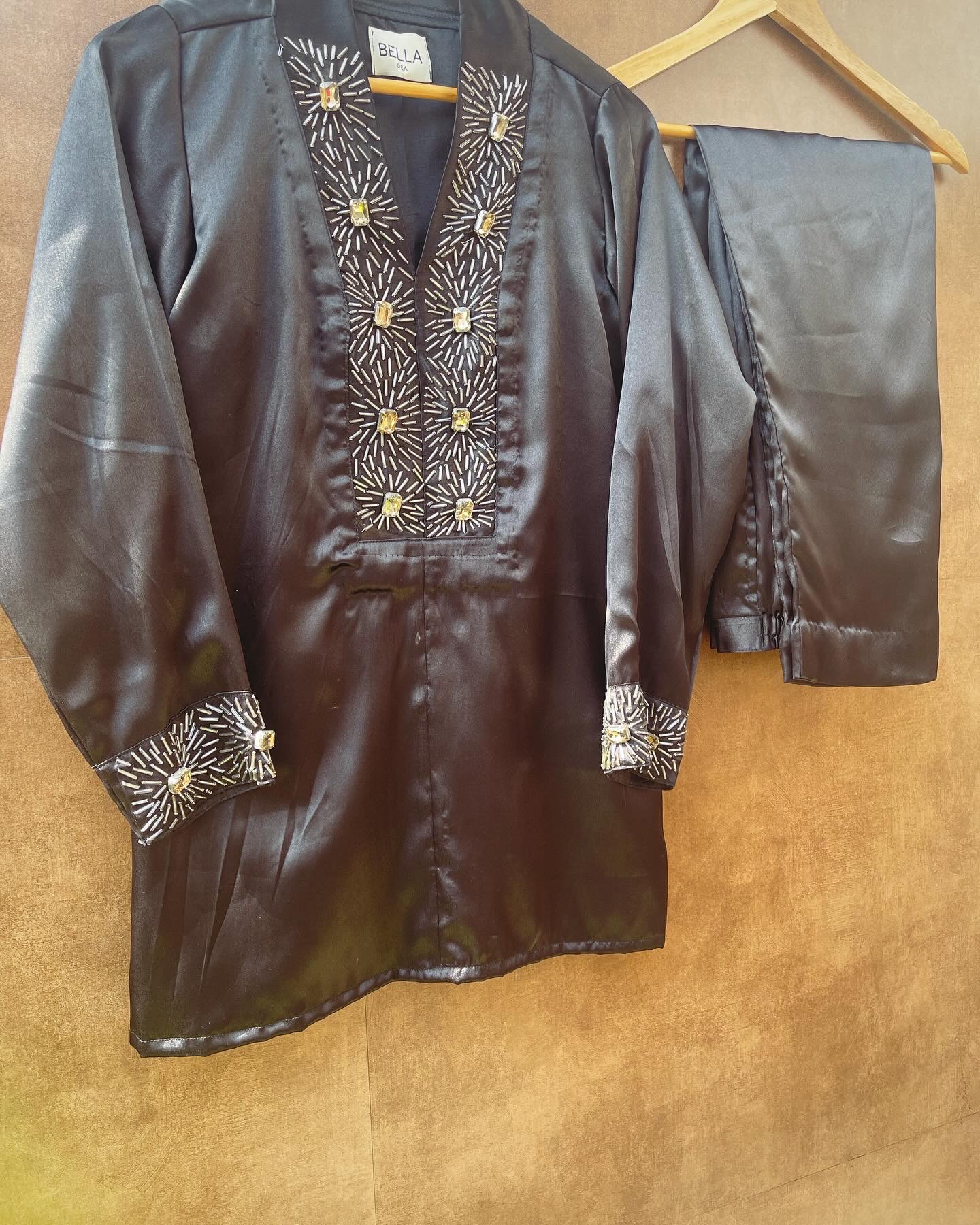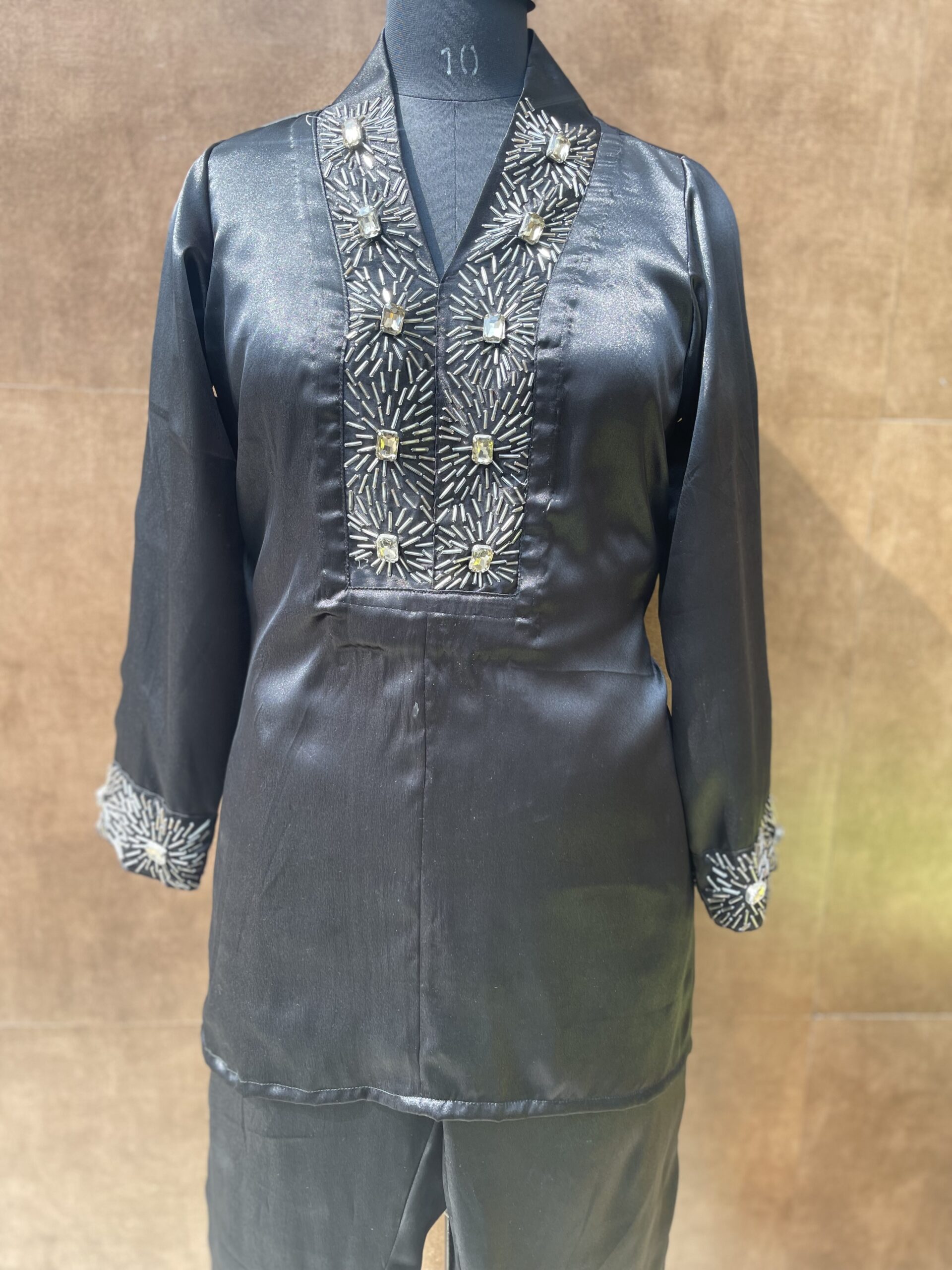 • Black satin top with handwork on the neckline and sleeves paired with satin pant.