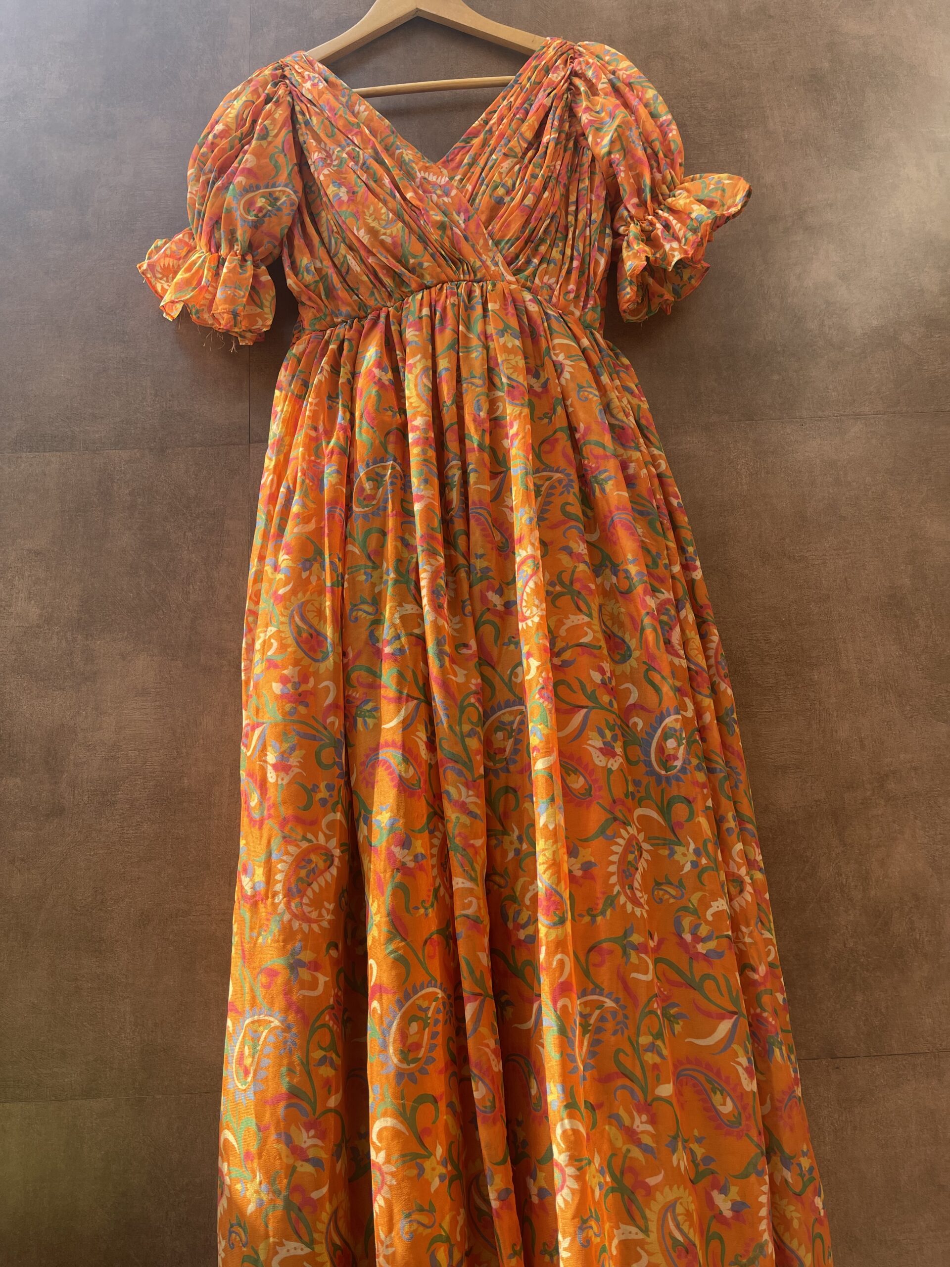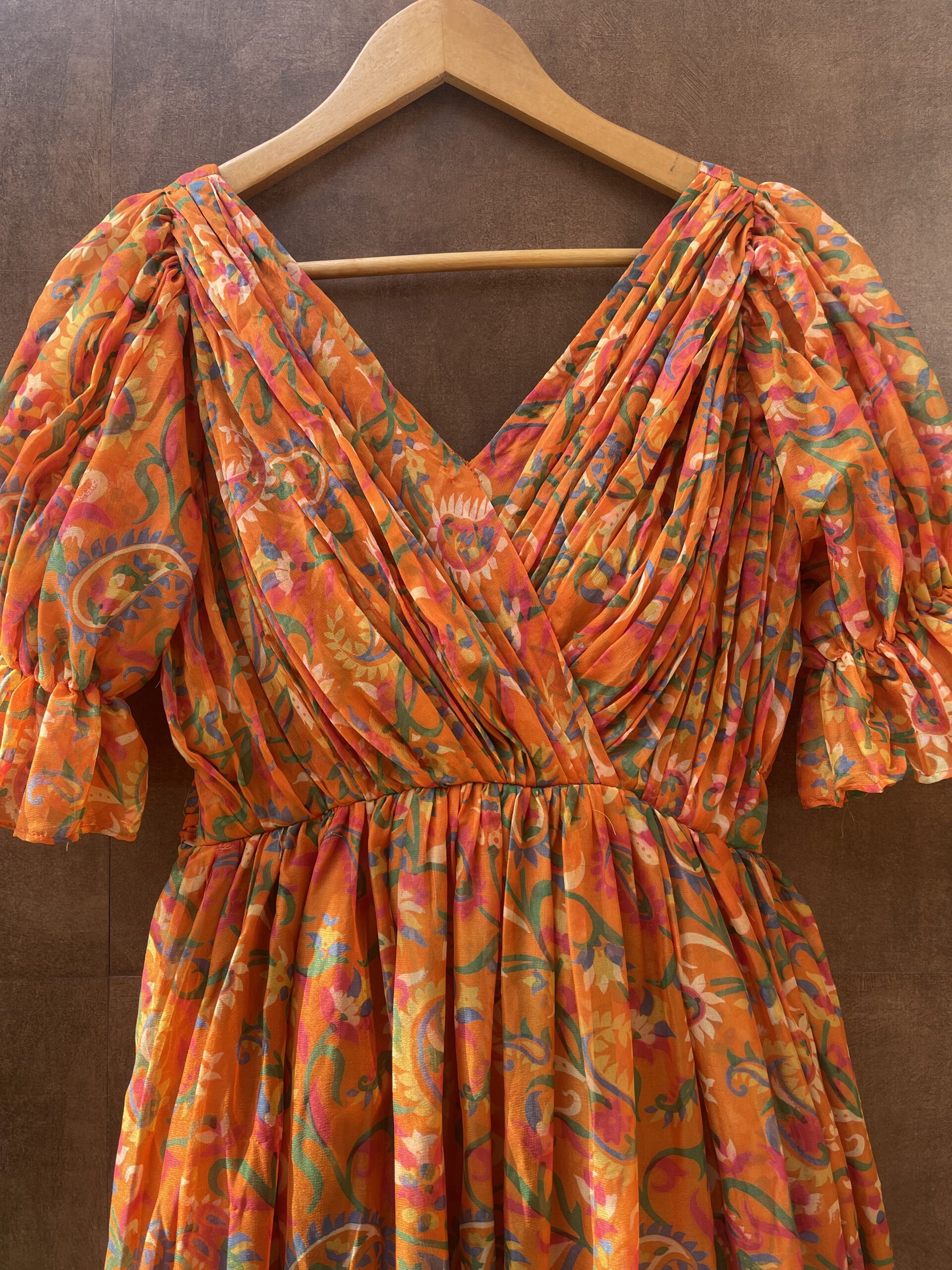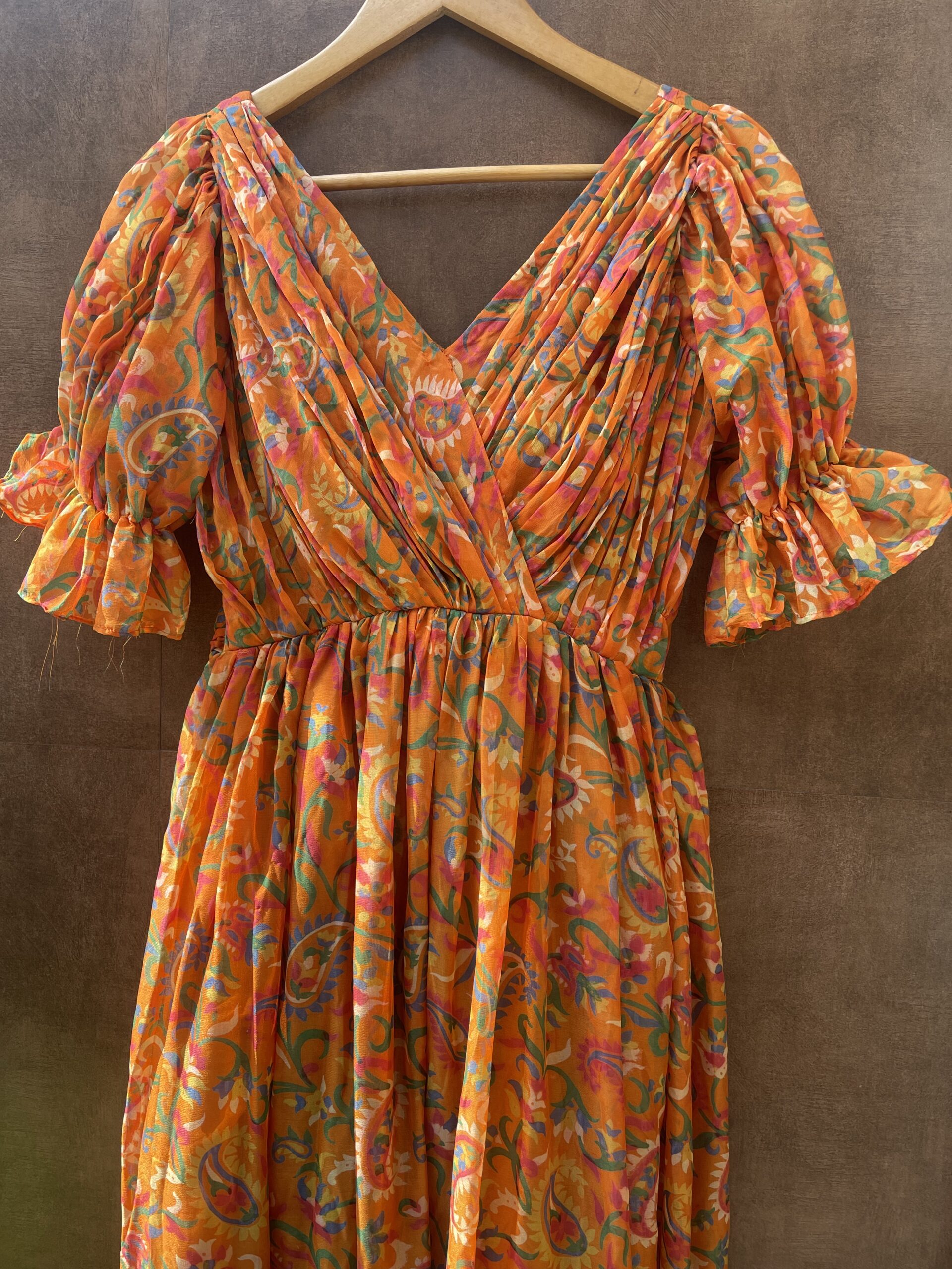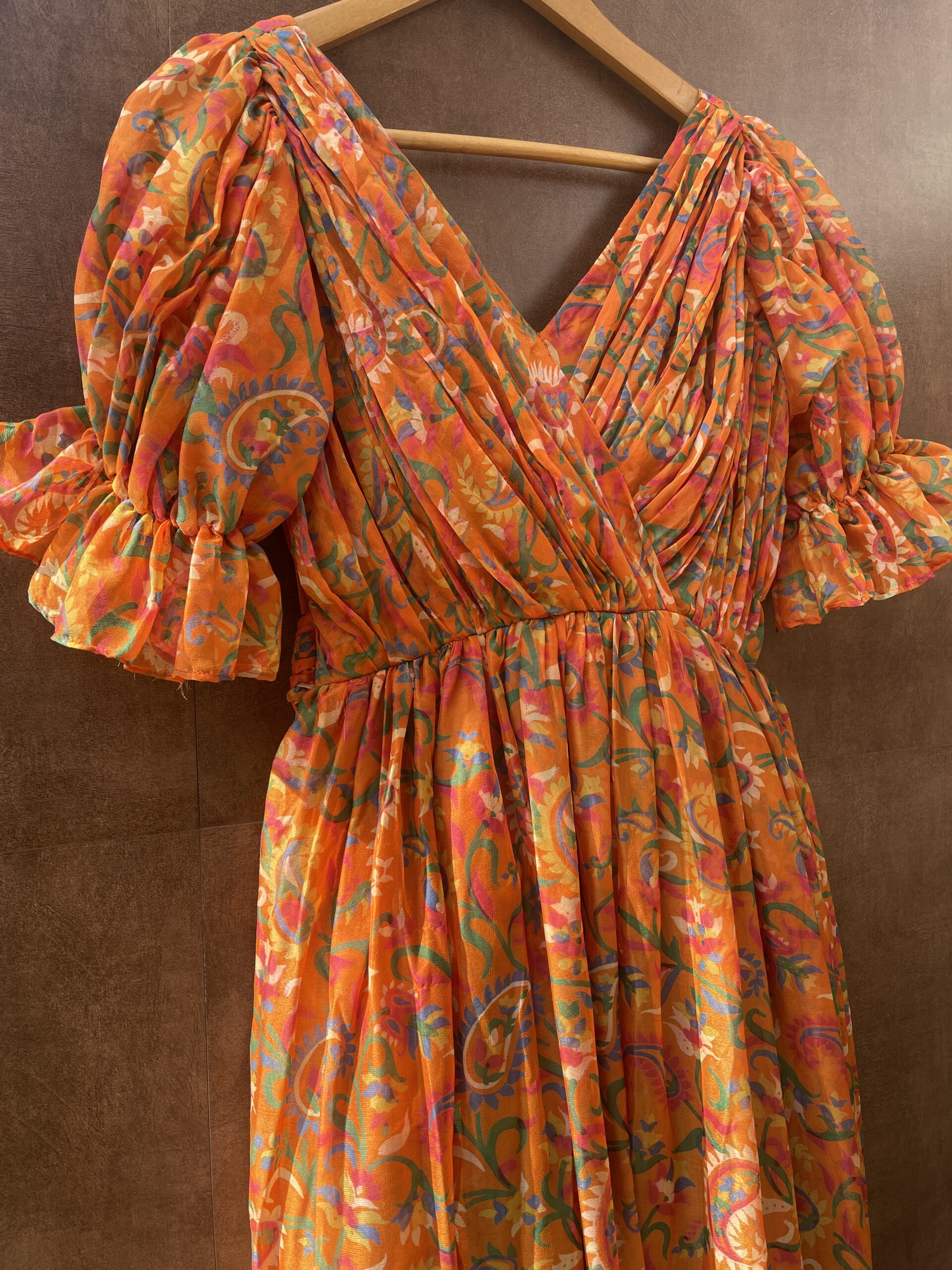 • Chiffon printed pleated dress, floor length dress with puff sleeve.