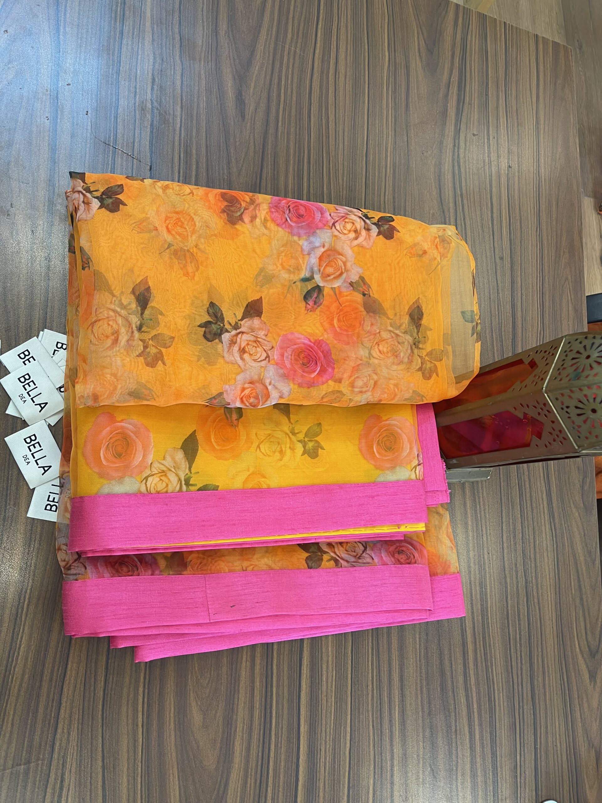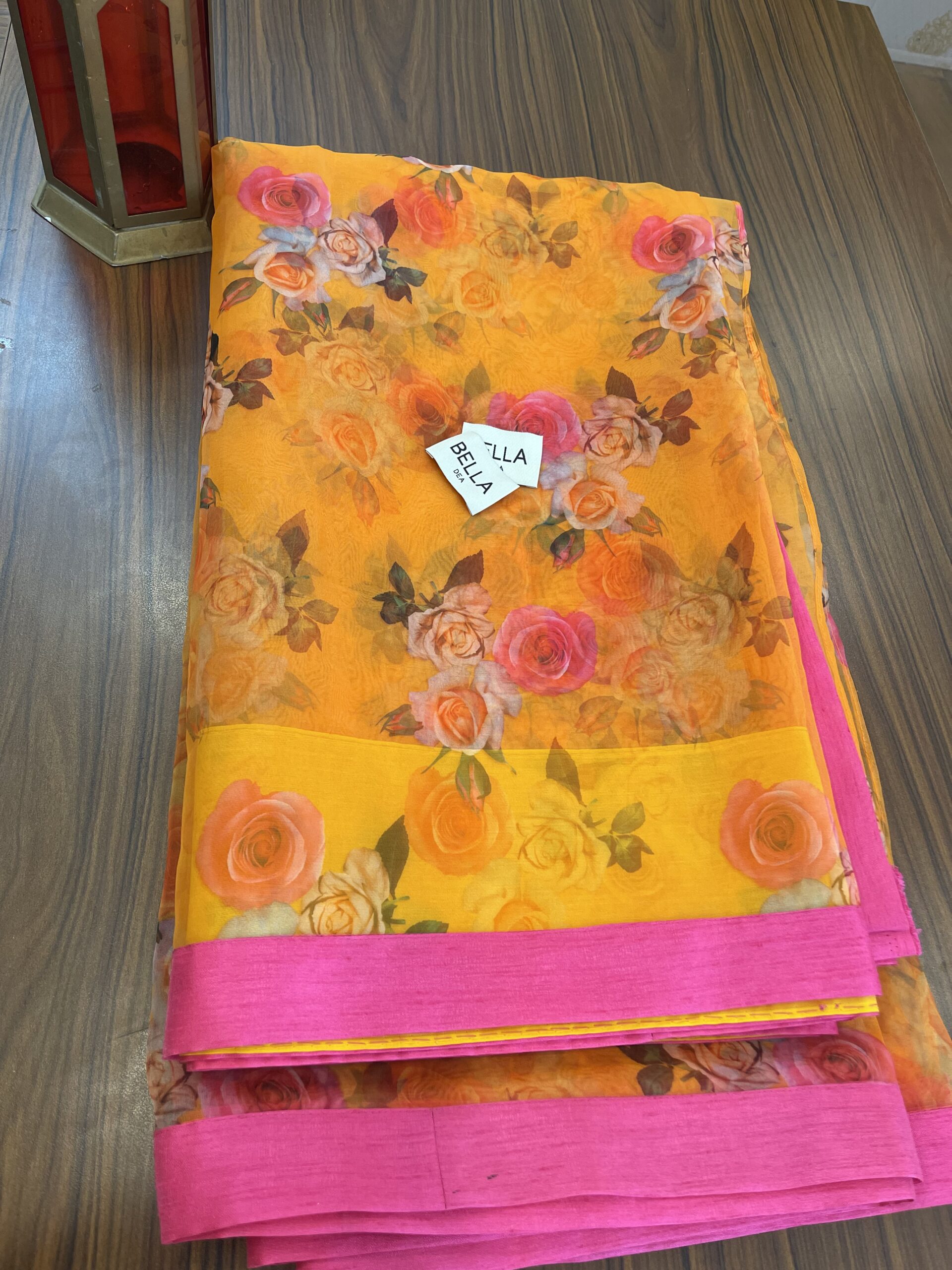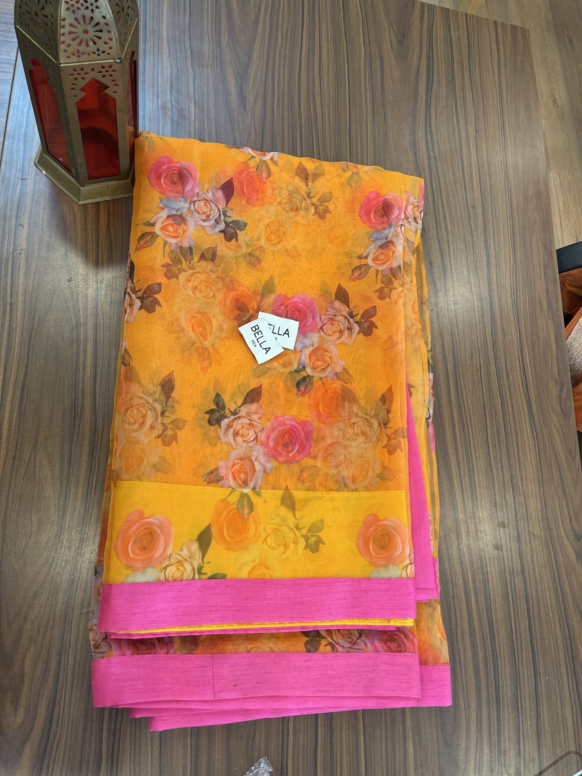 - Orange organza saree with magenta patti highlight on the sides.