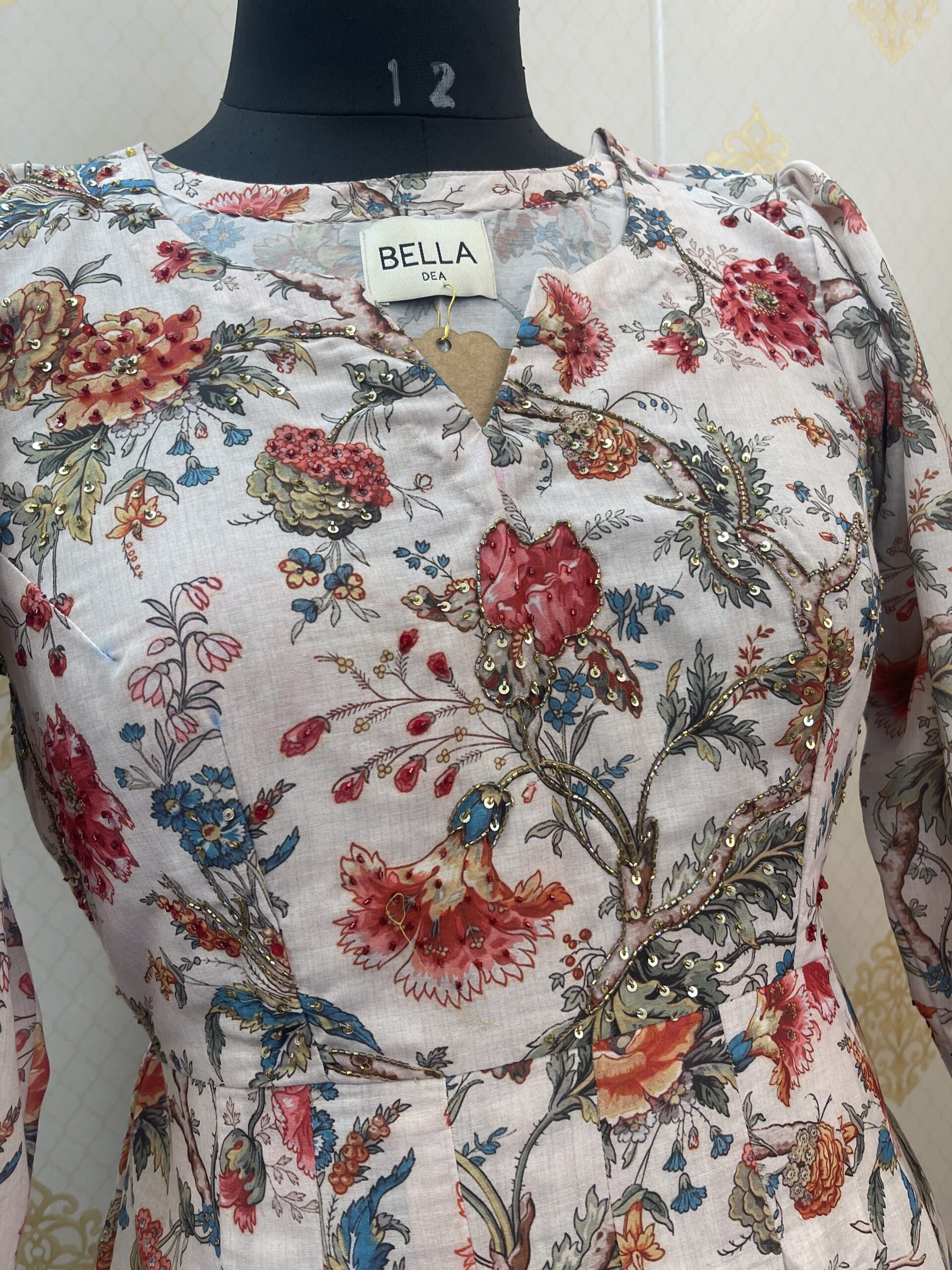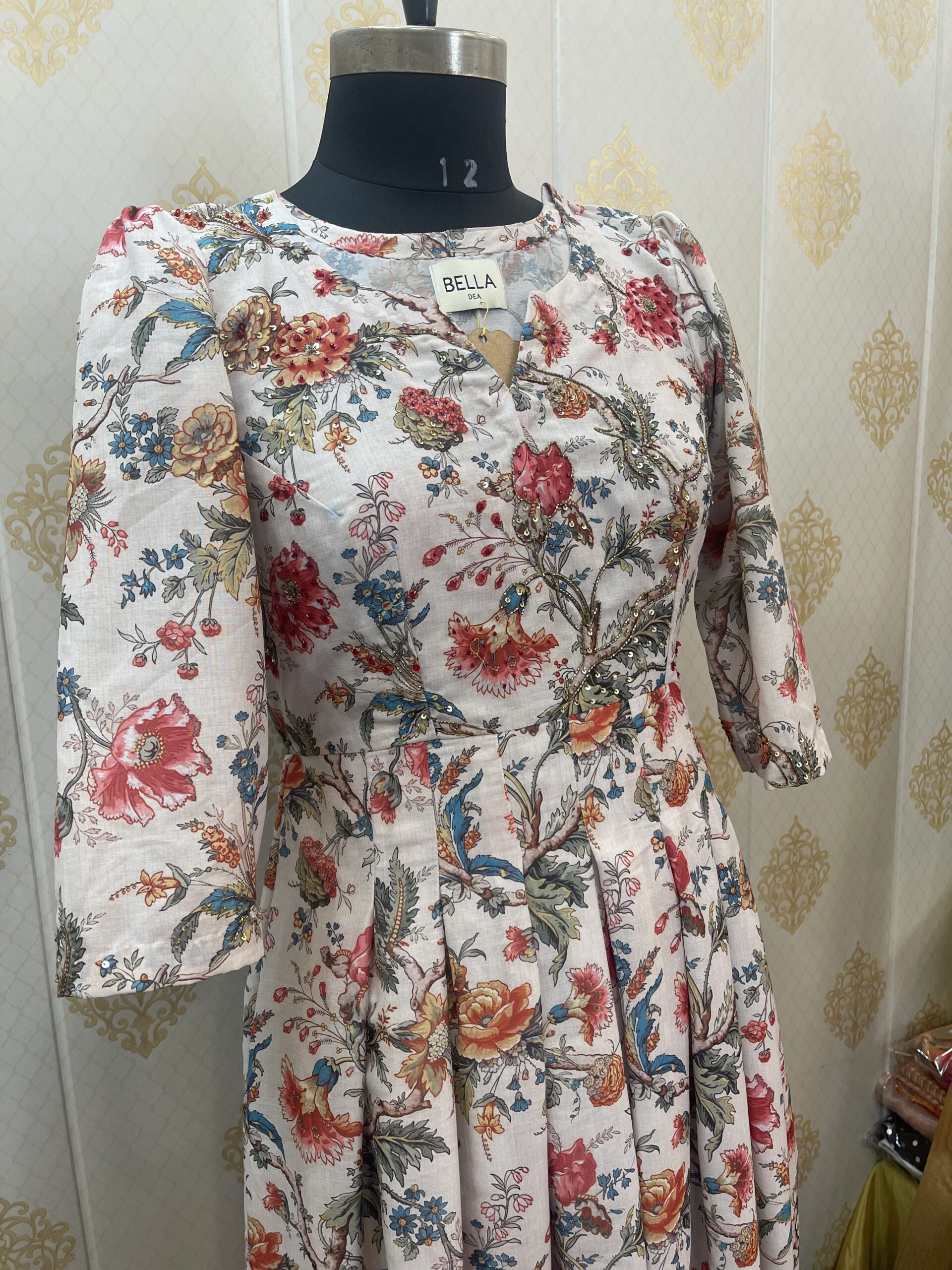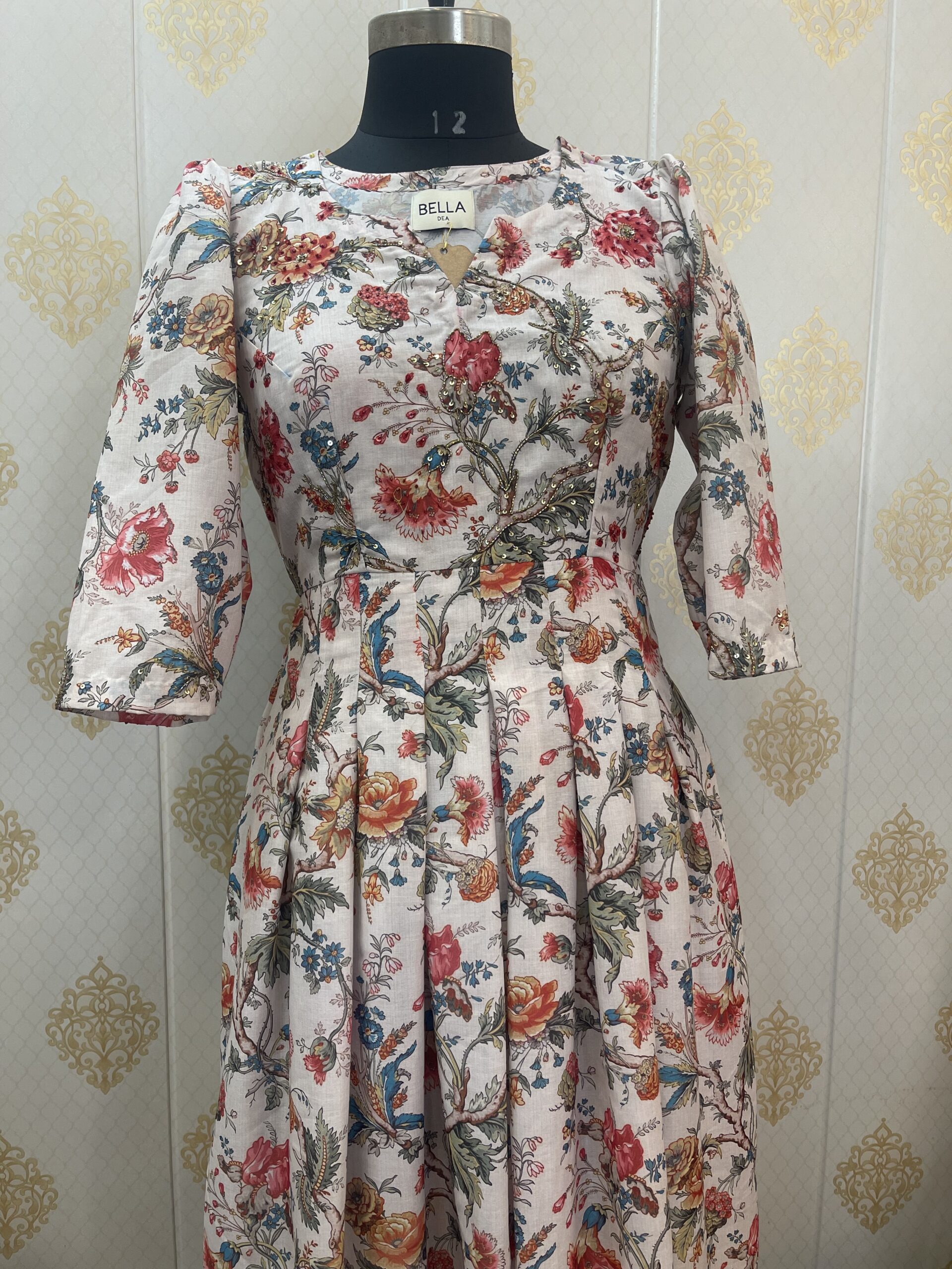 • Printed cotton pleated dress embellished with sequins and cutdana handwork.