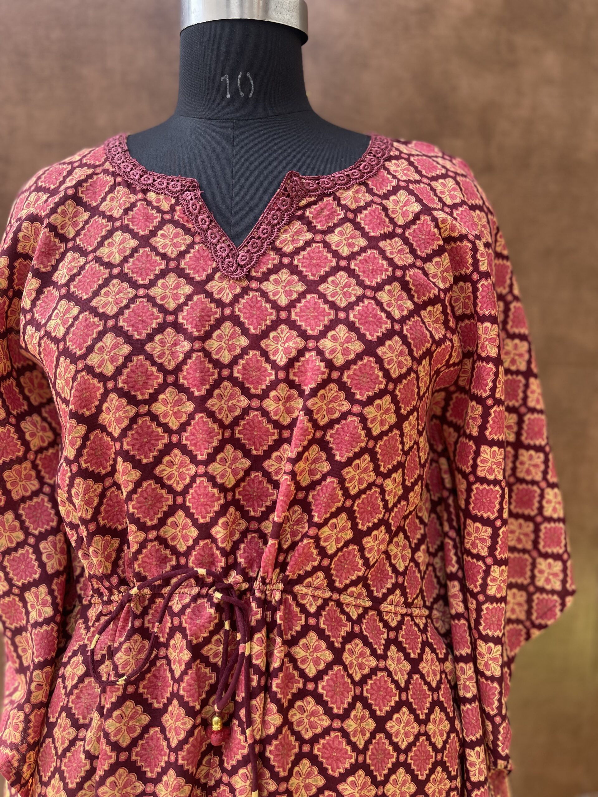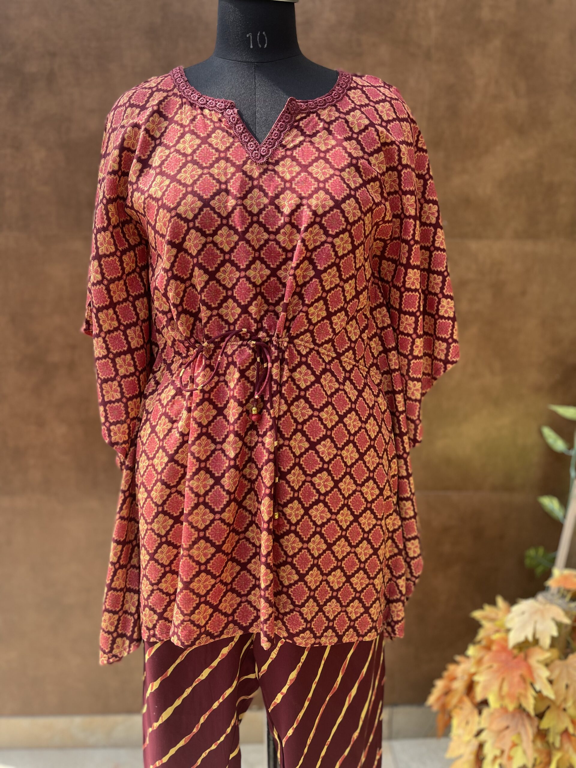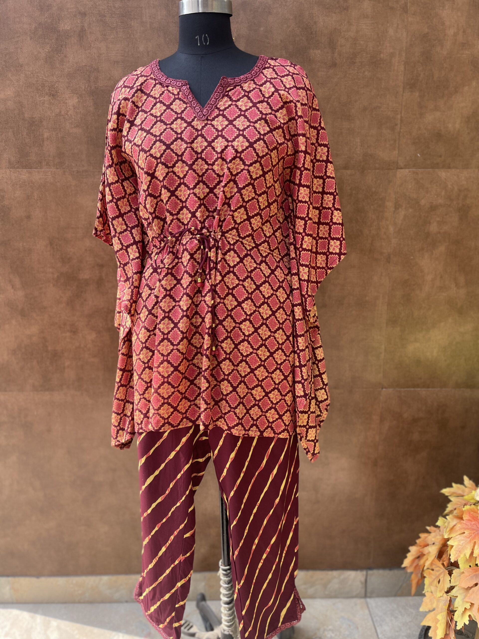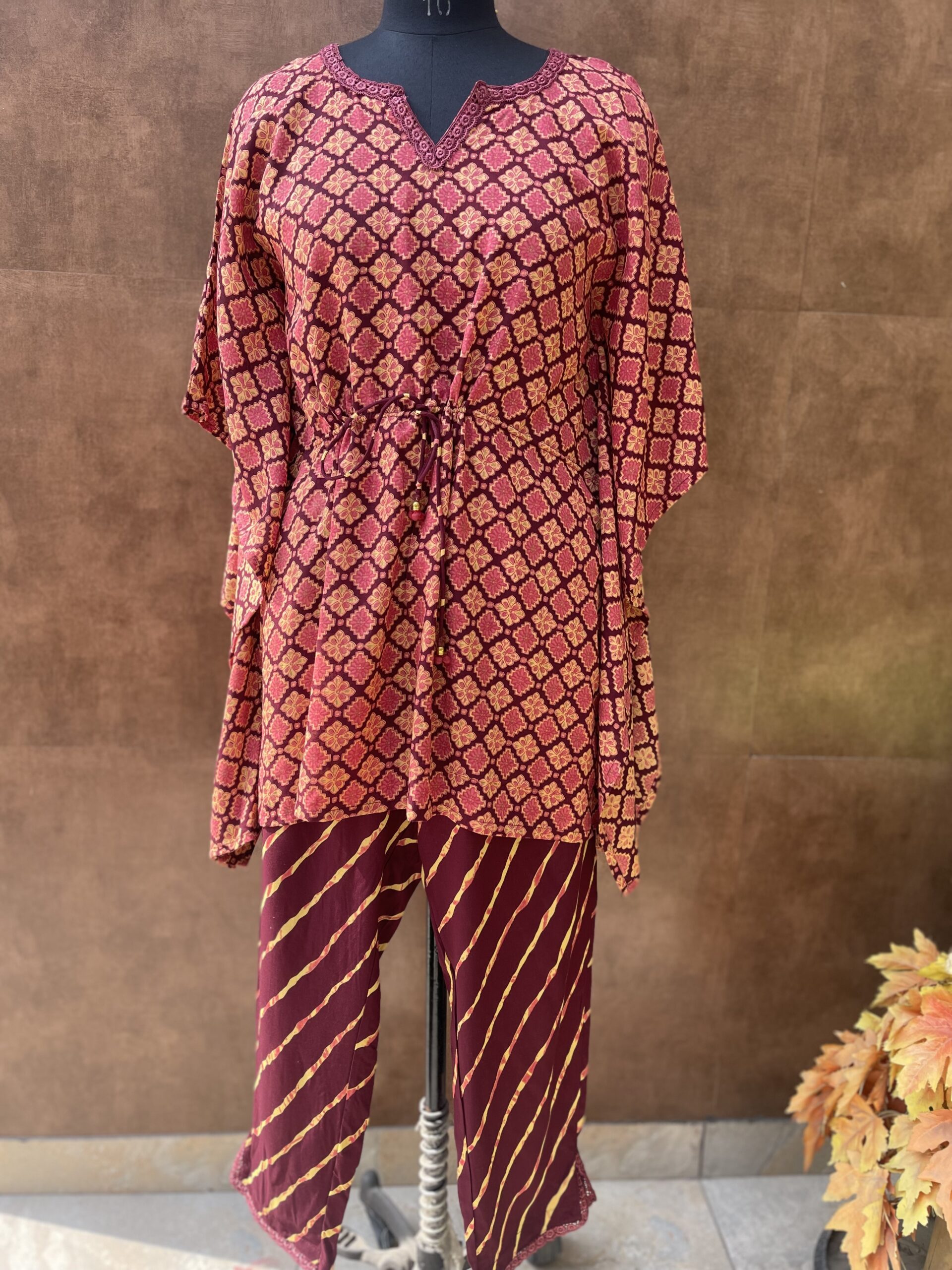 • Printed cotton kaftaan with lacework on the neck and pant set