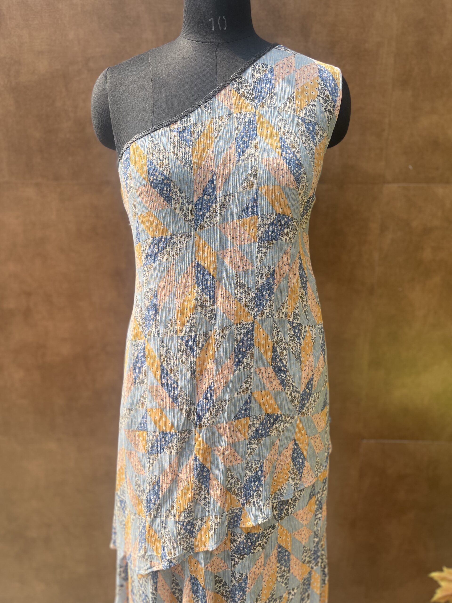 - Multicolored printed off shoulder top paired with the coordinating printed loose pants