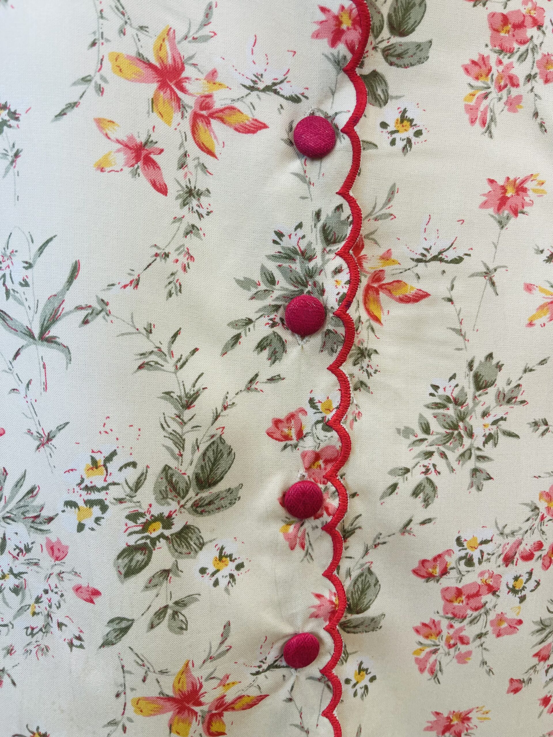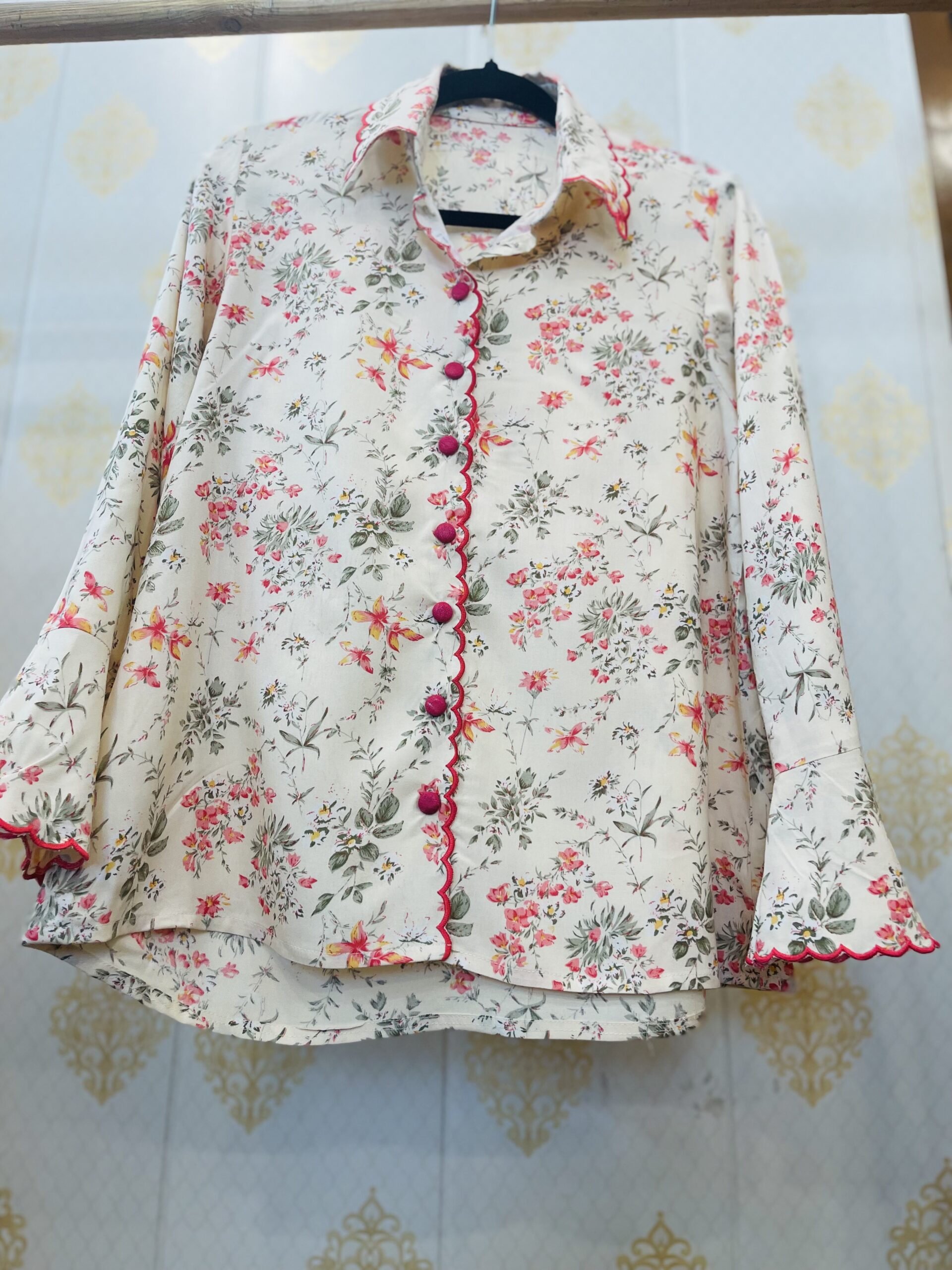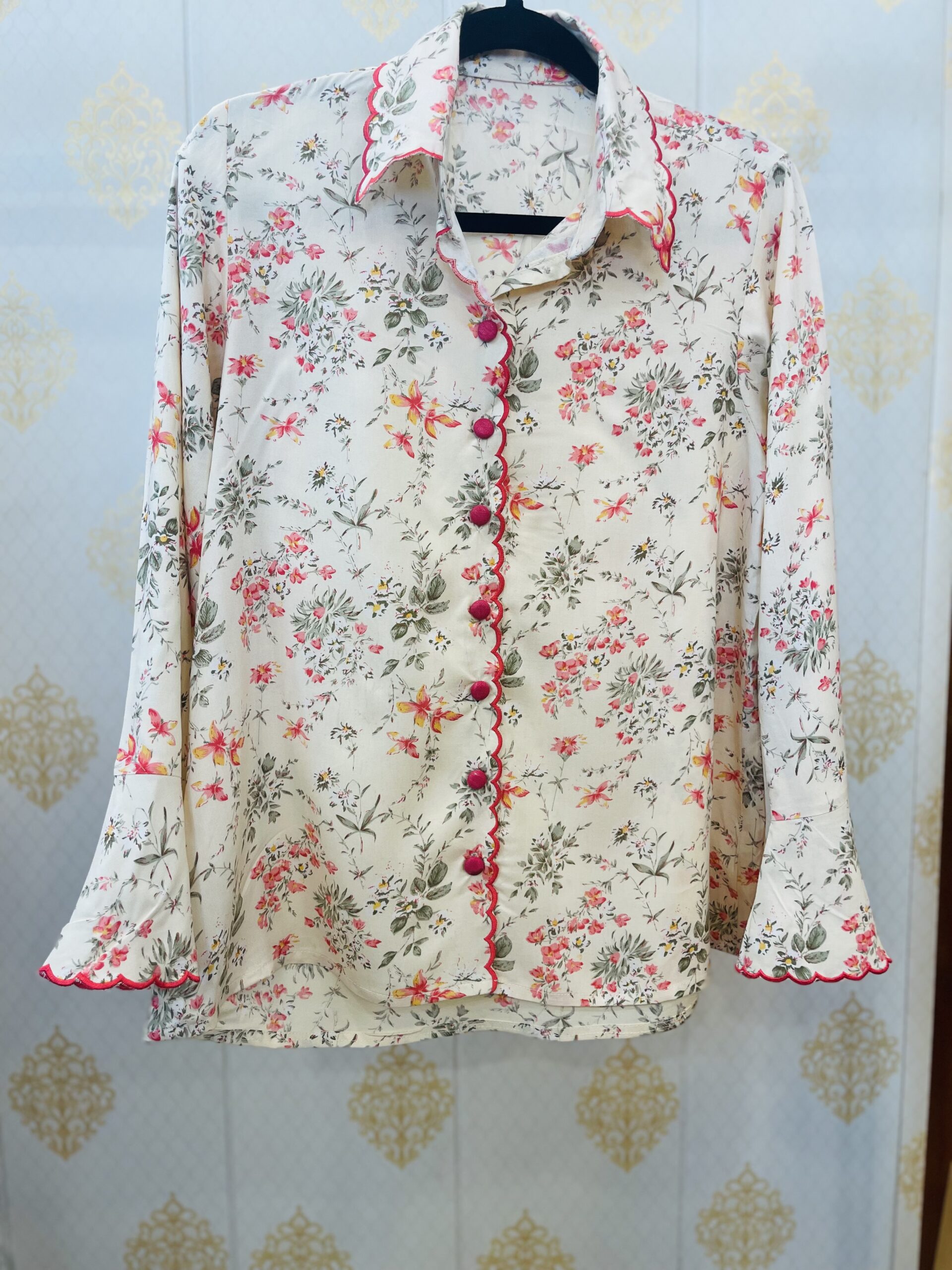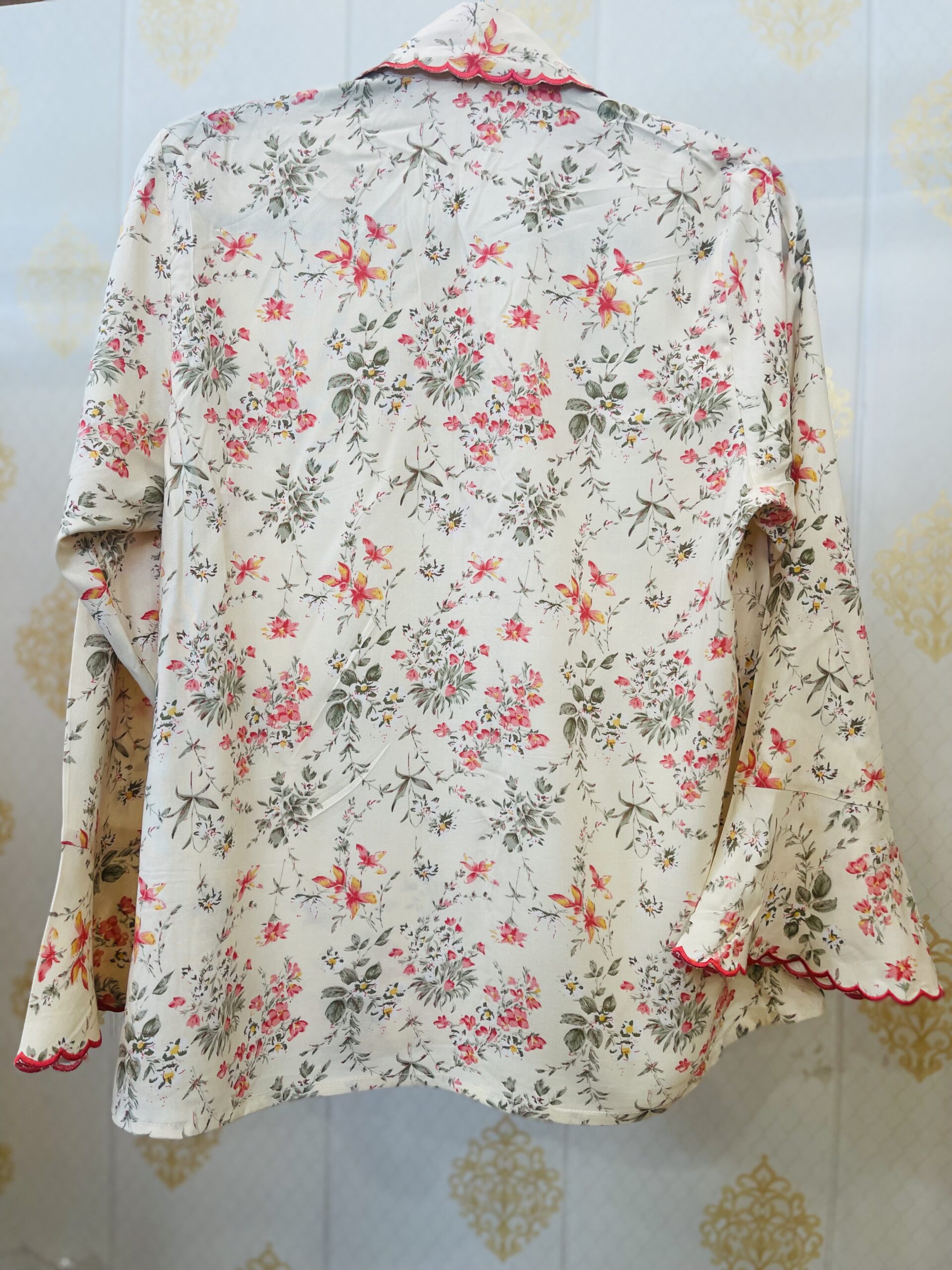 • Printed shirt style top with thread cutwork in front, collar and on sleeves.