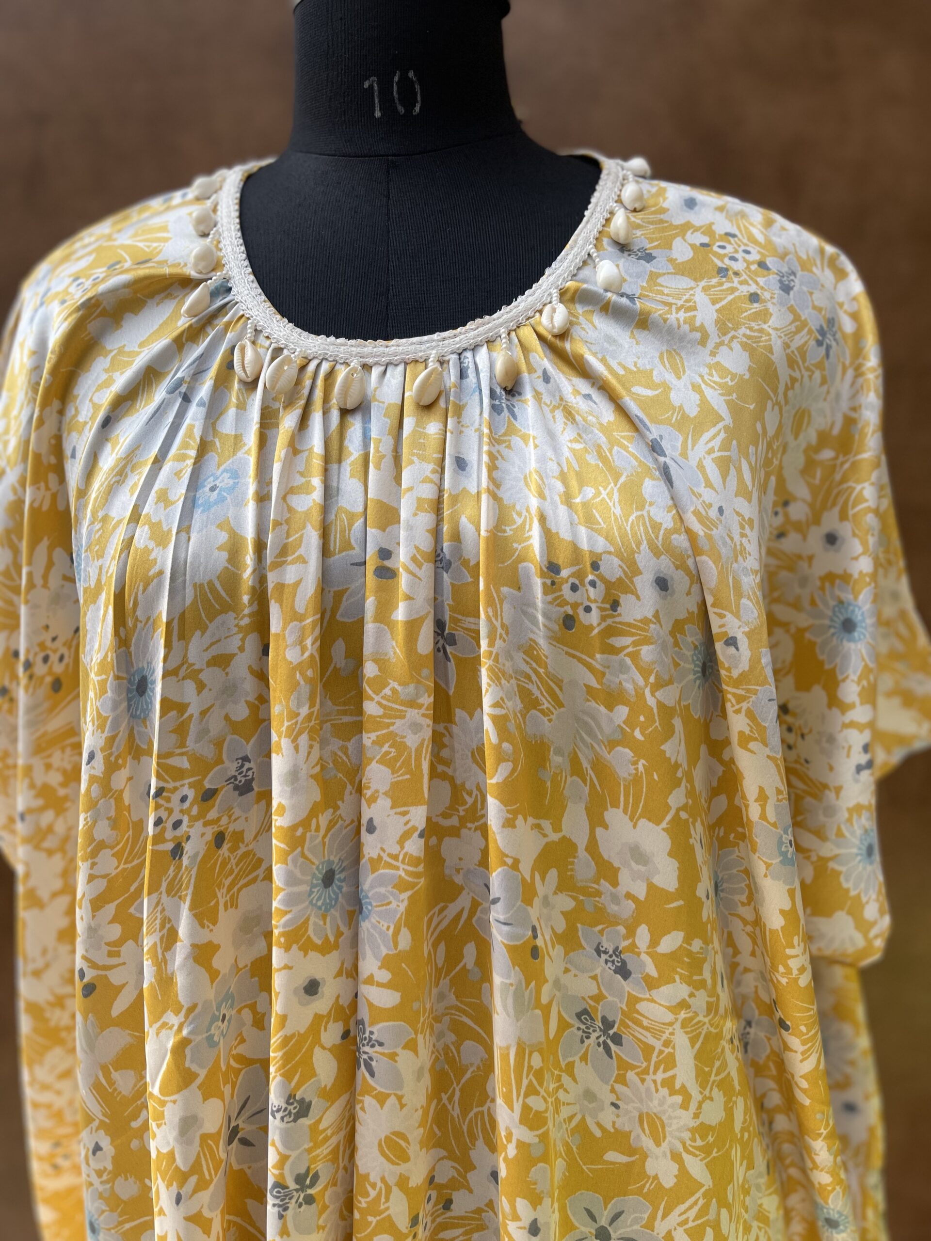 - Modal satin printed kaftaan top embellished with shell and mirror work lace.